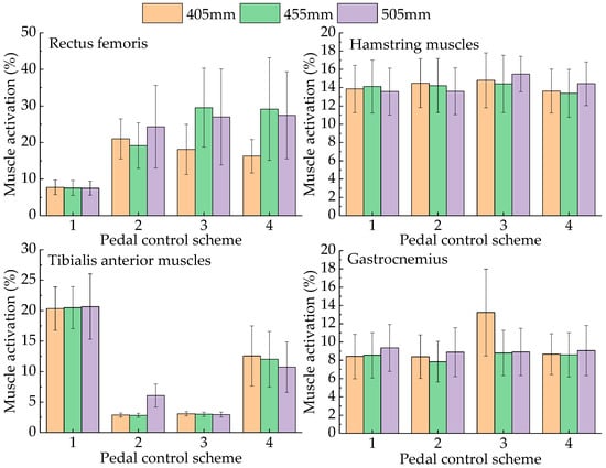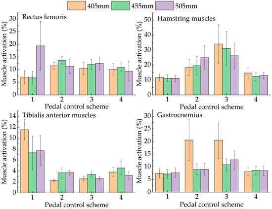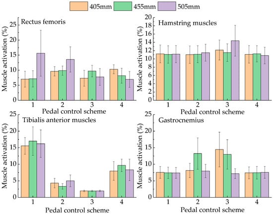 In this study, four experimental schemes were designed for pedal operation. In Scheme 1, the driver lightly put their foot on the pedal. In Scheme 2, the driver pressed the pedal at a constant speed to half the stroke. In Scheme 3, the driver pressed the pedal to the bottom at a constant speed. In Scheme 4, the driver relaxed the pedal at a constant speed until the moment before their foot left the pedal. We calculated the mean and standard deviation of muscle activation during pedal operation for three participants. The muscle activation when the drivers operated the accelerator pedal at seat heights of 405 mm, 455 mm, and 505 mm is shown in Figure 7.