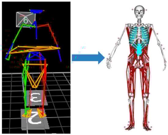 As there were differences in height and weight between the selected human whole-body musculoskeletal model and the drivers selected in the experiment, the model needed to be scaled to adjust the size and quality properties of each part of the body. We used the 3D coordinates of the marker points in the static calibration actions to correspond and scale the musculoskeletal model in OpenSim, as shown in Figure 10.