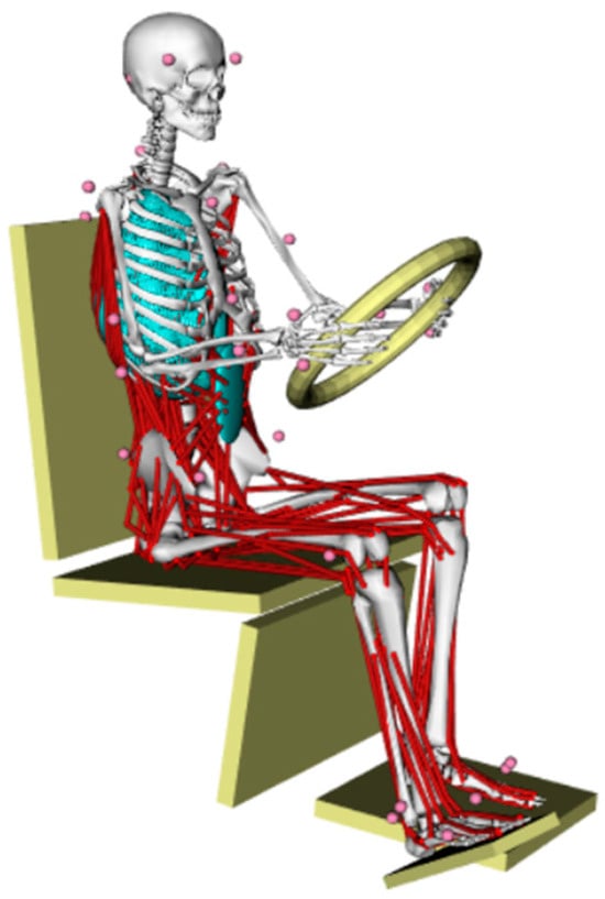 Commercial vehicle drivers often drive for extended periods, and as car seats and pedals are some of the components with which drivers make direct contact, the design of these affects drivers’ handling comfort [,]. Reasonable human–computer interaction design can effectively improve driving comfort. Traditional automobile manufacturers conduct driver comfort research based on subjective experiences, historical data, and costly prototype experiments []. Due to the limitations of traditional methods, computer-aided engineering (CAE) has been introduced into automotive ergonomics design, such as RAMSIS in Germany, ERGO and JACK in the United States, and Pam Comfort in France []. CAE technology enables automobile manufacturers to focus on drivers’ driving posture, the accessibility of cockpit components, and drivers’ field of vision through a 3D human–vehicle model at the beginning of the design process to ensure better ergonomic design. Due to the inability of CAE calculation methods to reveal the fatigue mechanisms of drivers in a more detailed manner at the level of human bones and muscles, it is difficult to quantitatively describe and simulate changes in the biomechanical characteristics of drivers’ bones and muscles. Many human musculoskeletal models have been established based on the combination of biomechanics and ergonomics disciplines [].