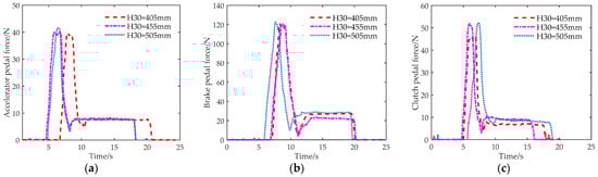 We used the LH-SZ-6W three-dimensional force sensor to collect the corresponding pedal resistance during a complete stepping process, as shown in Figure 12. Figure 12a–c, respectively, show the relationship between the pedal force and the stepping time of the driver when pressing the accelerator pedal, brake pedal, and clutch pedal at different seat heights. Pedal force can be used as input for inverse dynamics to solve the joint torque.