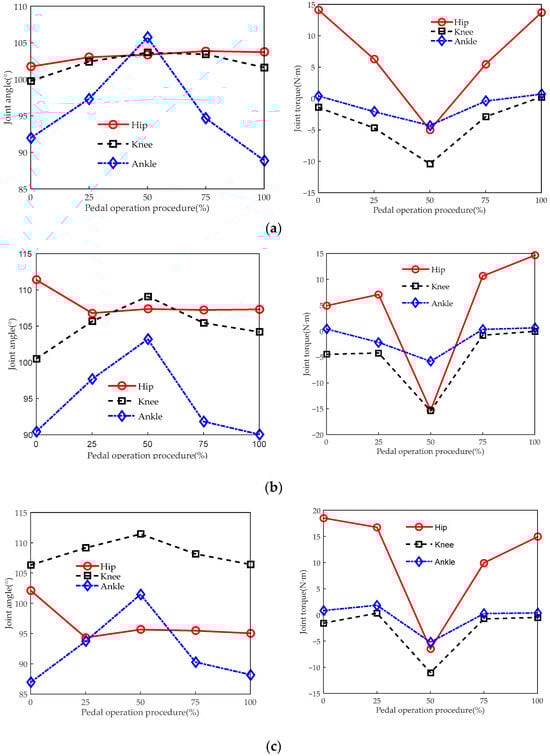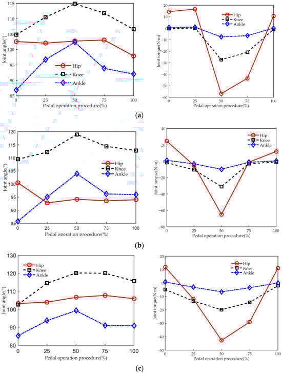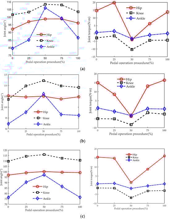 Biomechanical curves of the lower limbs when operating the brake pedal. The joint angles and joint torques correspond to seat heights of (a) 405 mm, (b) 455 mm, and (c) 505 mm.