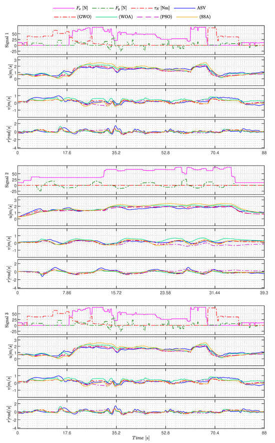 As for the other techniques, it is noteworthy that the estimated models exhibited behaviors closely resembling the ASV in 3 DoFs, as illustrated in Figure 13 and Figure 14. Among these techniques, it is worth mentioning that the GWO and MTDE methods delivered the best performances and outperformed the PSO. According to Table 11, GWO reduced the RMSE by approximately , while MTDE reduced it by when compared to PSO.