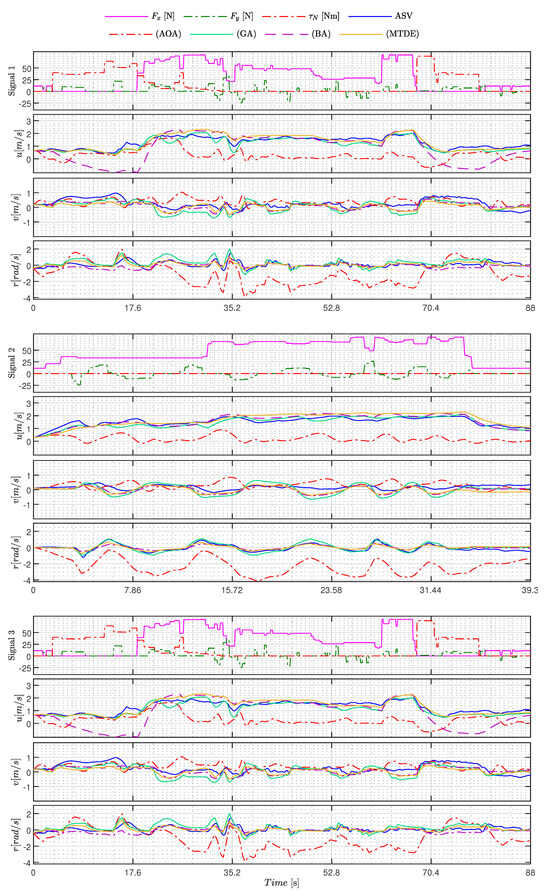 Considering that the experiments were conducted in an open environment exposed to wind, waves, and other external disturbances, the results remain consistent, except for the AOA and BA techniques. For instance, in the case of GWO, an RMSE of [m/s] was obtained for surge, and [m/s] for sway, which correspond to errors of and , respectively, when considering a linear speed operation of [m/s]. Regarding yaw movement, the RMSE error of [rad/s] would equate to if the ASV operated at full capacity. Hence, both results are acceptable under the presented conditions, and the same holds true for methods using multiple signals, as demonstrated in Figure 13 and Figure 14.