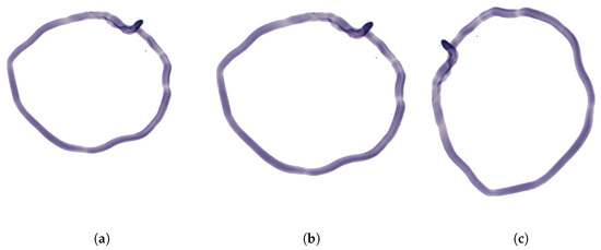 The augmentation process begins with the collection and manual labeling of artifacts in slide images using an image editing software, Krita (https://krita.org/, accessed 9 January 2023). The labeling is similar to the annotation of preview images using multilayer TIF files mentioned above. The new mask image has the same size as the original image and the region of interest (ROI) is marked in white while the background is in black (see Figure 5).