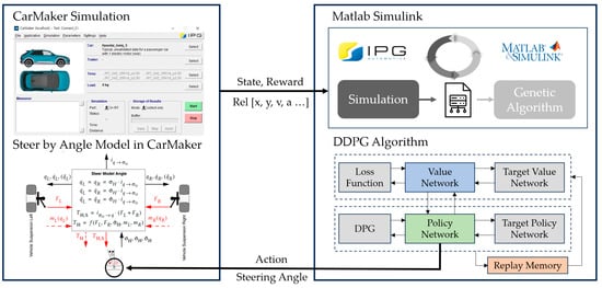 Vehicle simulation programs must adhere to certain crucial requirements to ensure that the simulation environment mimics real vehicle conditions. In particular, any discrepancies between the simulation and real environments can render the results inconclusive. Therefore, it is essential to configure a simulation environment that takes into account the dynamic elements of actual vehicles. Additionally, the simulation must be capable of being executed at speeds exceeding real-time requirements, because RL involves repeating scenarios and learning through trial and error. Compatibility with other software programs is also a key consideration, as it may be necessary to integrate the data generated within the vehicle simulation environment with other programs for training []. In this study, we satisfy these requirements by configuring the learning environment using the IPG CarMaker program version 11.1 and Matlab 2021a, ensuring seamless integration and compatibility with other software programs. This platform enables real-time monitoring of data during testing and faithful replication of realistic vehicle behavior through parameterized components, such as steering, tires, brakes, powertrain, and chassis. Moreover, it supports Simulink integration, enabling data analysis []. The DDPG RL agent is implemented using MATLAB Simulink, with the hyperparameters set as outlined in Table 1 to configure the learning environment.