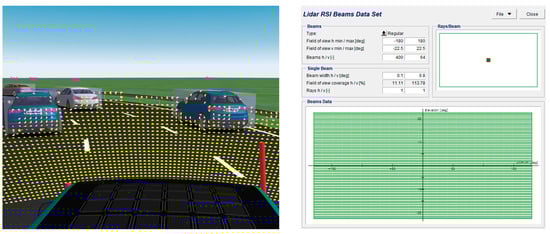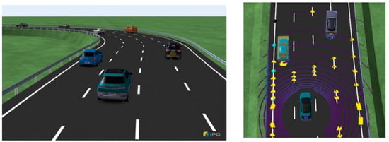 The LiDAR sensor was set up based on the specifications of the Ouster OS1-64. The OS1-64 LiDAR sensor actually boasts a vertical resolution of 64, a horizontal resolution of 1024, and a field of view ranging from 360 degrees horizontally and −22.5 degrees to 22.5 degrees vertically, as shown in Figure 2. The study does not use deep learning models for recognition. Instead, the state information provided to the reinforcement learning model is obtained through dynamic calculations within the simulation. However, to mimic the operational conditions of sensors installed in real vehicles and validate the applicability of the approach in real-world scenarios, we introduce Gaussian noise into the system [].