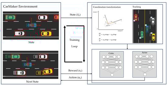 In summary, this paper proposes an LKS control method using DDPG RL, based on the movements of surrounding vehicles when lane recognition is compromised due to degraded camera sensor performance. As illustrated in Figure 1, learning is implemented in an integrated environment, combining the simulation program IPG CarMaker and MATLAB Simulink. Within the simulation environment of CarMaker, essential data pertaining to surrounding objects and the behavior of the vehicle is generated. This state information is subsequently transmitted to the Matlab Simulink environment. Following this data exchange, the steering control values, which are obtained through reinforcement learning, are then employed to govern the vehicle within the CarMaker environment. MATLAB Simulink is interconnected with CarMaker in real-time, enabling monitoring of control inputs and the vehicle outputs. Furthermore, it provides the Reinforcement Learning Toolbox, supporting reinforcement learning algorithms like DQN, PPO, and DDPG. This toolbox facilitates efficient development through hyperparameter configuration and training progress monitoring.