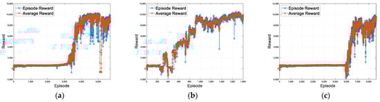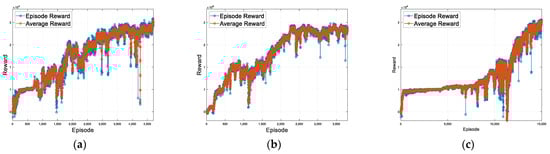 (a) Second scenario basic case training reward, (b) Second scenario guard rail case training reward. (c) Second scenario noise case training reward. Training reward plots for the second scenario RL.