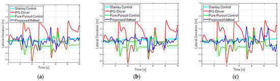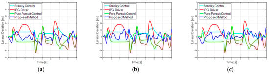 Figure 8 shows the increase in reward values as learning progresses and episodes accumulate. The horizontal axis of the graph represents the episode count, where each episode corresponds to the simulation starting and ending via termination conditions. The vertical axis represents the rewards, indicating the cumulative reward values for each episode. When compared to the basic case, the guardrail case with added guardrail information showed the fastest and highest performance during learning. In contrast, the Gaussian case demonstrated slower learning progress due to the noise. In the first scenario, the basic, guard rail, and noise cases demonstrate successful completion of the course without any collisions in the initial 40 s, starting from episodes 3415, 509, and 6185, respectively. Figure 9 shows the lane center tracking performance of the proposed method for lane maintenance compared with those of three lateral control methods: the pure pursuit controller, Stanley controller, and IPG driver. In the graph, the horizontal axis represents simulation time, while the vertical axis represents lateral deviation. The proposed method, which is based on RL learning using information from surrounding vehicles, demonstrates performance similar to a traditional controller such as a pure pursuit or Stanley controller that operates with knowledge of lane information. At a target speed of 50 kph, maximum lateral errors of 0.2507 m, 0.2387 m, and 0.2850 m are observed in the basic, guard rail, and noise cases, respectively. This result showcases that the proposed approach can effectively perform lateral control for autonomous vehicles using information from surrounding vehicles.