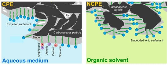 Regarding carbon paste electrodes (CPEs) in combination with surfactants, the resultant configurations represent one of the most popular types of chemically modified variants of these heterogeneous electrochemical sensors, whose electrode material is usually prepared by hand-mixing powdered graphite with non-polar and highly viscous liquid binders (typically, mineral or silicone oils [,]). In fact, there are two basic types of surfactant-modified CPEs, namely (i) surface-modified [,] and (ii) bulk-modified variants [,]. The difference between these two types can be well illustrated in their specific microstructure as shown in Figure 1.