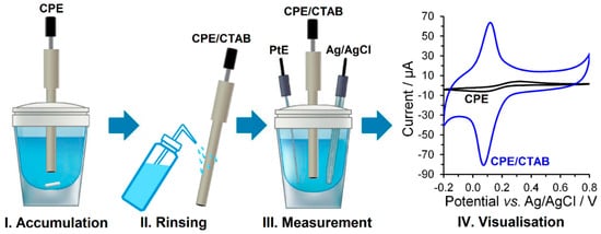 The modification of the surface with a surfactant was carried out by immersing the bare CPE into an aqueous solution of the given surfactant (0, 0.1, 0.5, 1.0, and 2 mmol L−1) stirred at 400 rpm for chosen time (0, 2, 4, 6, 8, and 10 min). After rinsing with a stream of distilled water, the surfactant-modified CPEs could be taken for their subsequent electrochemical characterisation. All the necessary steps, including the final visualisation of the respective voltammogram, are shown in Figure 2.