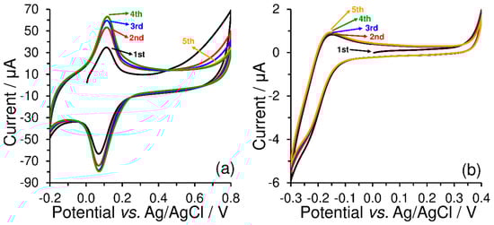 As shown in Figure 3, redox peak current responses ( and ) increased simultaneously with the number of cycles, when constant current responses of the used redox couples were observed only after the third repetition. From the comparison of the current yields of the respective electrode reactions performed in 0.1 mol L−1 phosphate buffer (pH 7), it is evident that electrostatic interactions between the sulfonate groups and [Ru(NH3)6]3+ cations are not similar to those of the quaternary ammonium salts with the [Fe(CN)6]3−.