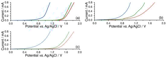 Linear-sweep voltammograms of 0.1 mol L−1 acetate buffer (pH 4; red), phosphate buffer (pH 7; green), and ammonia buffer (pH 10; blue curve) recorded on bare CPE (solid; a), CPE-CTAB (dashed; b), and CPE-SDS (dotted lines; c) at potential step of 5 mV and scan rate of 50 mV s−1.