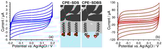 If CPEs are modified with surfactants that differ only in the type of polar head (i.e., sulfonate, benzenesulfonate, cetyltrimethylammonium, and lauryl dimethylammonium) and then investigated by CV in 0.1 mol L−1 KOH at a scan rate ranging from 50 to 500 mV s−1 (see Figure 5), one obtains completely different values of double-layer capacitance ( Namely, the respective values were calculated as follows: 0.068 mF cm−2 for the bare CPE, 0.088 mF cm−2 for CPE-SDS, 2.7 mF cm−2 for CPE-SDBS, 3.9 mF cm−2 for CPE-CTAB, and, finally, 11.1 mF cm−2 for CPE-DDAB. Thus, it seems that the obtained values largely reflect the surface microstructures of modified CPEs. For example, compared to SDS, the presence of a benzene ring in the molecular structure of SDBS extends the length of the non-polar tail, which gives rise to a longer distance between the electrode surface and the ions in the Helmholtz double layer. Analogically, this is a reason why a non-polar long-alkyl chain of DDAB markedly increased the double-layer capacitance in comparison with that at three methyl groups of CTAB. Such interpretation implies that the choice and number of accumulated surfactants increase the background currents, which may deteriorate the analytical performance of the corresponding voltammetric methods.