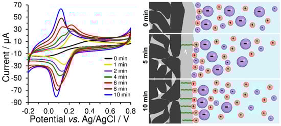 So far, only a few reports have been devoted to an explanation of why the intentional treatment by surfactants causes a several-fold increase in the current response and a shift of the peak potential to lower values. Besides the already mentioned electrostatic interactions [], Kauffmann et al. pointed out the removal of a thin layer of the binder from carbon particles by the action of surfactant molecules and called it “carbon paste erosion” [], causing a hydrophilization and significant increase in the electrochemically active surface area (ECSA). Moreover, the different wettability of the bare carbon paste layer of a non-polar nature in contrast with a polar surface of surfactant-modified carbon paste can be another interpretation of significantly altered properties of modified CPEs [].