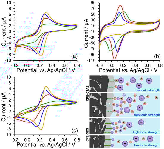 Unlike the peak separation, ΔEp = 85 mV, obtained at the bare CPE, a value close to 25 mV was achieved using CPE-CTAB for hexacyanoferrate (II)/(III) redox couple in 0.01 mol L−1 KCl at a scan rate of 50 mV s−1. However, if the concentration of the supporting electrolyte is higher than 1 mol L−1 (see orange curves in Figure 8), the effect of the electrostatic interaction will be already less pronounced, manifested solely via the increased background (baseline). This behaviour was also confirmed by the experiments performed with CPE-SDS, when electrostatic repulsion had decreased the reversibility of the redox system investigated (compare green curves in Figure 8a,c), while almost identical cyclic voltammogram as at the bare CPE could be obtained at high ionic strength (see again orange curves in Figure 8a,c). For illustration, all the above-mentioned phenomena are shown by the scheme in Figure 8.