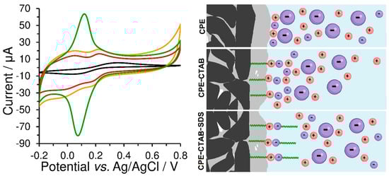 Ion pairing of cationic surfactants with anionic ones is generally known and practically used for their titration with potentiometric indication, which enables us to determine their total contents []. Here, a two-stage accumulation performed ex-situ was used to modify the CPE surface with a double layer of mutually paired surfactants. At first, the bare CPE was immersed into a stirred solution of 1 mmol L−1 CTAB for 10 min and so-obtained CPE-CTAB configuration then transferred into a stirred solution of 1 mmol L−1 SDS for 10 min (or vice versa). The resultant CPE modified with two types of surfactants in parallel, i.e., the CPE-CTAB-SDS type, exhibited a completely non-polar character, which was comparable with that represented by CPE surface modified with a non-ionic Triton X-100 (CPE-Triton X-100 type); see Figure 9. The latter was prepared by immersing the bare CPE into a stirred solution with 1 mmol L−1 Triton X-100 for 2 min. From Figure 8, it can be deduced that the surface modifications of CPE with mutually paired surfactants or with non-ionic surfactants are not very suitable for voltammetric analysis of substances of ionic nature because of the undesirable increase in the background currents.