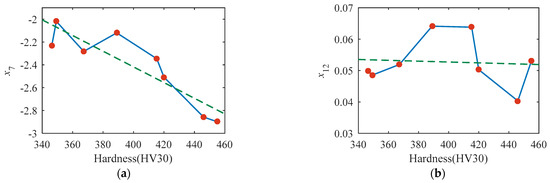 The dependencies of the selected magnetic features on the surface hardness are shown in Figure 8. The value of x7 is approximately linearly dependent on surface hardness, whereas the other three features (x12, x19, and x37) demonstrate the nonlinear dependency on surface hardness.