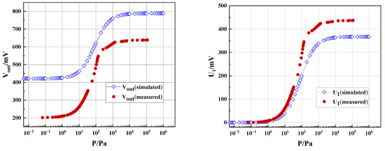 Figure 10b shows U1 as the function of pressure. Despite the large discrepancy in Figure 10a, the trends of the two curves from measurement and simulation in Figure 10b are quite consistent, suggesting that the simulation results are good guidance for device design. As shown in Figure 10c, the actual range of measurement of pressure is close to the simulated values of 2 × 10−2 to 2 × 105 Pa. As shown in Figure 10d, the actual average sensitivity is much larger than the simulated value of 52.4 mV/lgPa, with the highest sensitivity up to 457.6 mV/lgPa. It has good linearity at 10–1000 Pa, and the average sensitivity in this range is 179.2 mV/lgPa, which is also better than the simulation result of 148.8 mV/lgPa.