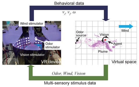In recent years, methods of investigating the adaptability or robustness of animals during localization or navigation behavior by using virtual reality (VR) have gained traction []. Experiments using VR have proven to be effective for mammals and insects [,,]. The observation of insects by using virtual reality has revealed multisensory motor-integration mechanisms during navigation. It has been clarified that an insect moves efficiently by using odor and multiple pieces of sensory information in localization behavior to an odor source []. This is because the insect modulates its behavior according to the input timing and amount of multiple sensory stimuli, which may be the key to adaptive behavior in complex environments. Although there have been studies that have shown that multiple sensory information (odor and wind) can be used to search odor sources, the scope of application is limited because it is a simple algorithm that reflexively switches actions according to the detection status of multiple sensors [,].