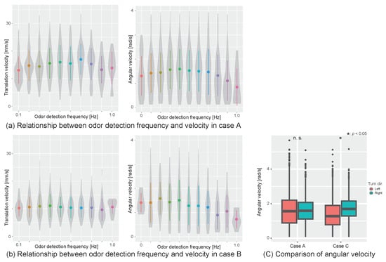Figure 2 shows the change in velocity when the experiment was conducted under the three conditions in Table 1. The horizontal axis of Figure 2a,b are the odor frequency (Hz), which indicates how often the agent detects the odor per unit of time. The odor frequency was adopted because it has been reported in previous research that an insect’s behavior changes according to the frequency at which the odor is detected []. When the translational speed is set on the vertical axis, we found that if the odor and wind detection directions are the same, the search is actively performed at up to 0.7 Hz, and the speed decreases to over 0.7 Hz (Figure 2a). However, when the odor and wind detection directions were different, the velocity was always low regardless of the odor frequency (Figure 2b). The graph of angular velocity on the vertical axis (Figure 2a,b) shows that the velocity peaked at 0.4 Hz when the wind and odor were detected in the same direction but peaked at 0.2 Hz when the wind and odor were detected in different directions. In an experiment with visual stimuli operation, the left–right angular velocity balance was maintained when the visual stimuli were given correctly, but when the visual stimuli were different from the behavioral output, the left–right angular velocity balance was disrupted (Figure 2c). This may be because the silk moth controls postural through vision.