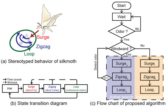 This section explains a proposed algorithm. Previously, Kanzaki et al. [] reported that the localization behavior of a silk moth comprises a stereotyped behavioral pattern. Based on this report, a surge-zigzagging algorithm [,] was proposed for odor plume tracking, and our proposed algorithm here is also based on this algorithm. As shown in Figure 3a,b, the surge-zigzagging algorithm comprises three states: surge, zigzag, and loop. Surge is a transitional state upon detecting an odor stimulus and moving in the detected direction. The surge duration is approximately 0.5 s [], and after 0.5 s, it transitions to the zigzag state, which turns left and right. In the zigzag state, it turns left and right three times on average and transitions to a loop state in which it continues to rotate in a certain direction on the fourth turn. In either surge, zigzag, or loop, when an odor stimulus is detected, it transits to the surge state. In the conventional surge-zigzagging algorithm, it takes a constant velocity in any behavioral state.