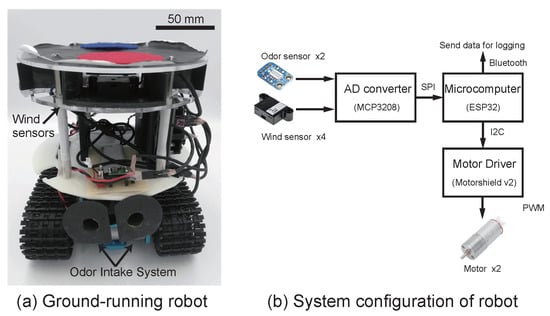 Here, a robot with a crawler-type drive system was constructed to move even when the ground is uneven because the robot is expected to conduct experiments indoors and outdoors (Figure 4a). The robot has two alcohol sensors (MICS-5524, Amphenol SGX Sensortech, Switzerland) and four wind sensors (D6F-W01A1, Omron, Japan). The silk moth actively takes in odor in its direction by flapping its wings, which has been reported to be effective in localization behavior toward the female [,]. Thus, we did not simply mount the alcohol sensors on the robot but installed them into an active odor-intaking system []. Because the odor sensors have a low temporal resolution problem, we addressed this issue by using an inverse model-estimation method based on the ARX model []. The directionality of the wind sensors was increased by installing a partition between each wind sensor [,], allowing them to discriminate between four different directions.