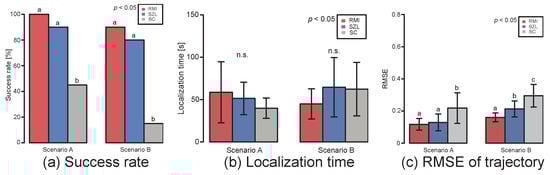 Results of 20 repeated experiments. Results of (a) search success rate, (b) localization time, and (c) RMSE for trajectory. Groups sharing the same letter are not significantly different.