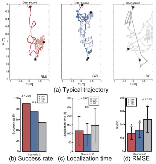 where n, , and  are the total number of steps, the y-coordinate of the robot at time i, and the y-coordinate of the odor source, respectively. This allows quantitative expression of how much meandering in the crosswind direction was involved in the localization. The smaller the value of RMSE, the more smoothly it moved through the odor plume. Because the RMSE value of the RMI algorithm is significantly small in Scenarios A and B (Steel–Dwass test, p < 0.05), the RMI algorithm can search without depending on the location relationship of the odor and the wind source.