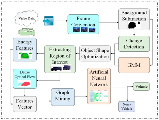 Various studies experimented with tracking and locating moving cars using video monitoring. Typically, the video monitoring system incorporates both stationary and mobile objects. The primary objective is to determine the physical motion of a rotating shaft in a certain area. Objects within the video system may be recognized using moving object approaches [,]. This approach allows for the automatic detection and surveillance of moving traffic within a video frame. The classification of vehicular traffic is utilized to establish a relationship between objectives or object pieces in two sequences and to obtain characteristics about the target, such as its trajectory, acceleration, and orientation. Objects are discovered frame by frame in a movie by using the scanning of passing vehicles. It has multiple applications, including video surveillance, network monitoring, and people tracking []. On the other hand, several variables in the past several years, such as speed, consistency, and small distance, have become bothersome automobile traffic problems. The climate and heavy emphasis also significantly impact achieving correct detection findings [].