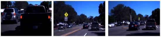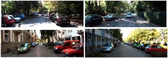 KITTI is among the most often used datasets in robotic manipulators and automated vehicles []. It contains hours of videotaped traffic events captured with several screen protectors, such as increased RGB, grayscale photogrammetry, and 3D infrared sensors. However, despite its prominence, the resource does not provide feature extraction contextual information. Meanwhile, a number of researchers have annotated portions of the database to meet their needs. Figure 10 shows the example images for KITTI dataset.