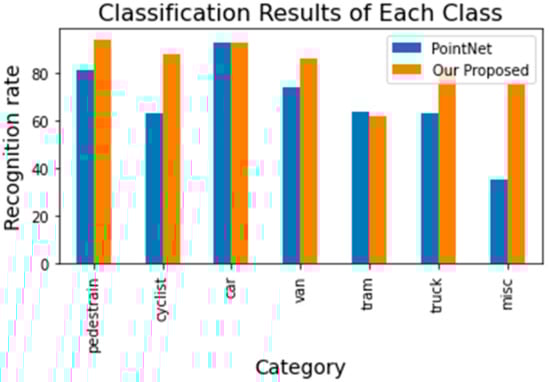 The confusion matrix of the KITTI-7 dataset achieved a mean recognition rate of 82.85%, presented in Figure 11. Figure 12 shows the classification result of each category of the proposed MTMS with PointNet.