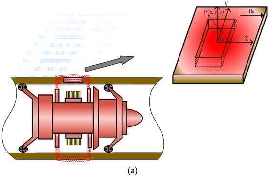 At present, magnetic charge models are widely used in the analysis of magnetic leakage fields [25,26]. As shown in Figure 1b, magnetic charges are generated at the defects and distributed on the side walls. The magnetic leakage field, when the micro-element surface dydz on the side wall is distant from point p, is formulated as follows:
