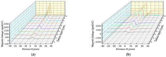 As can be seen from Equation (7), the influence results of the depth and width are consistent. Therefore, the variation rules of the magnetic leakage signals of the improved model and the classical model under different defect depths were studied. The width Dy = 1 mm, length Dx = 1 mm, and depth Dz were set as 1–10 mm to simulate the variation rules of the magnetic leakage signals with different defect lengths. (Figure 14).