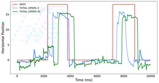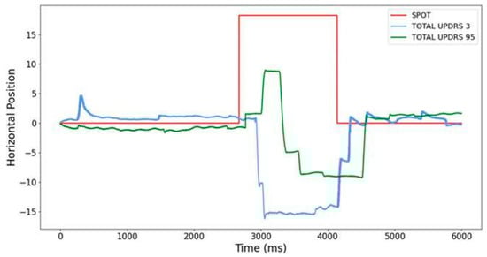 Saccades at various stages of PD. Recordings were performed with different UPDRS measured in clinical conditions under a doctor’s supervision. The red line is related to light spot movements, and the blue and green curves are related to reflexive saccades performed by two different PD patients in different stages of the disease: the blue curve denotes EM at the beginning of the disease, and the green curve at advanced PD. Notice the significant difference in response latencies [].