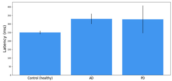A comparison of the average results +/− SD of the AS latencies, obtained in a group of 27 age-matched normal controls (healthy people), 10 AD subjects, and 12 patients with PD. The averages of the control group and AD patients are derived from the research results obtained from [] and the average of the PD patients from the results obtained from [].