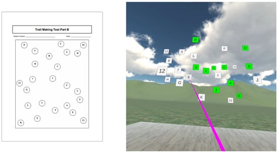 The wide availability of devices and improving quality mean they are being used on an increasing scale. Therefore, VR technology could be the next gold standard in cognitive assessment. The need for new tools has emerged from criticism of the current cognitive screening tools because these tests often (30 of 50 classical screening tools) miss a visuospatial component, such as the Clock Drawing Test, the Cube Drawing Test, and the Intersecting Shapes Test []. Because visuospatial tasks demonstrate significant diagnostic and prognostic potential in AD [], VR applications have great potential as an assessment tool in dementia []. One example is shown in Figure 4, where the standard executive function Trial B test is performed in 3D instead of 2D (on the paper). In this case, in addition to engaging executive processes related to 2D, the subject must also activate 3D orientation processes that often fail in ND (especially in AD).