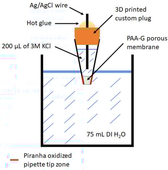 During the preparation of reference electrodes, the formation of a semi-permeable layer within the capillary is more advantageous than the attachment of semipermeable membranes to the tip of this capillary. In the design phase, 200 µL pipette tips were chosen as the RE body because they were just the right size for handling and have convenient volume, a sufficiently thin end, and, most importantly, a conical shape. The conical shape is one of the requirements as it can be easily press-fitted into electrochemical prototype devices while ensuring a leak-proof fit while still being easily replaceable. Even though the construction of this type of reference electrode was described more than 20 years ago [], the use of a glued-on top membrane was inappropriate because it is difficult or nearly impossible to create small circular membranes. Furthermore, the application of commercial Naf ion membranes is also problematic because the choice of membranes with a pore size less than 1 µm is limited even though it is much larger than those of porous glass membranes (2–4 nm). To leave the electrode size defined by the pipette tip, it was decided to make a membrane inside of the pipette tip; thus, casting of the uncured polymer solution was the best option as it can potentially provide better adhesion to the electrode body. In Figure 1, the design of the reference electrode is presented. The oxidation of the pipette tips was implied during the testing phase because, prior to oxidation, they showed inconsistent permeability of the ions. During oxidation with Piranha solution, the polypropylene surface was presumably covered with functional -OH groups [] which, in our case, were observed to promote the adhesion of PAM-G adhesion to the pipette tip surface.