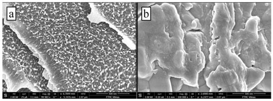 The gel structures were also inspected with scanning electron microscopy. Two different types of membranes were prepared: (i) with 1 M KCl in the gelation solution, and (ii) without any KCl in the gelation solution. It was hypothesized that the gel formed from a gelation solution containing KCl would have some advanced network of microstructures and nanostructures. Before imaging, the PAM-G samples were frozen and lyophilized. It was determined that the lyophilization disrupted the gel and that large voids appeared in the hydrogel samples. We believe, however, that the formed micro and nanostructures were not affected by this treatment. On evaluation, the addition of KCl alters swelling and the formation of PAM-G gels []. Gel swelling in the presence of salts is a common phenomenon and is also documented with other types of polymers, such as polyvinyl alcohol [], etc. In our study, gels formed from KCl containing gelation solution were observed to have microstructures that resemble rarely porous odd-shaped monolithic folds (Figure 2b), while gels without KCl were porous and contained consistent nanosized spheres that form the whole microstructure (Figure 2a). Similar PAM-G structures have also been described by other authors [,]. The PAM-G structure represented in Figure 2a was more regular and uniform, which also led us to believe that the integrity and performance of the whole structure is more unified. Thus, PAM-G membranes formed from gelation solution without any KCl can potentially be more efficient in the sense of controlling the semipermeability of formed gels. Hence, reported PAM-G-based reference electrodes are suited for short-term measurements. During long-term measurements, however, the KCl from the inner solution tends to diffuse slowly through the pores of the hydrogel, so a slight potential drift can be observed during long-lasting electrochemical experiments.