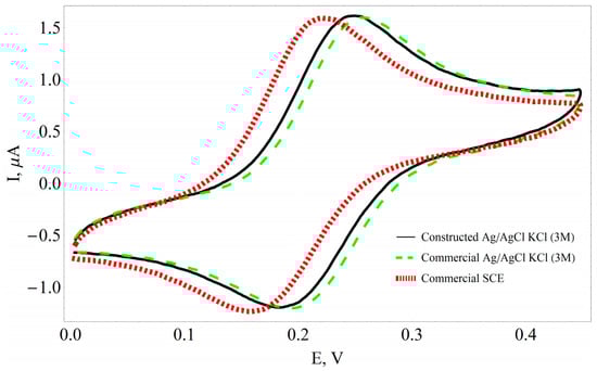 Cyclic voltammetry was performed to assess and compare the performance of RE reported here with that of commercially available reference electrodes (SCE and Ag/AgCl electrode). The redox couple of HMF(ox.)/HMF(red.) based on the oxidized/reduced states of the ions (Fe2+/Fe3+) was examined by cyclic voltammetry in a three-electrode electrochemical setup. A good correlation was observed between CVs with the homemade electrode and the commercially available reference electrodes (Figure 3). The difference between the homemade electrode and the commercially available Ag/AgCl-based reference electrode may have occurred as a result of experimental error. According to the literature, the difference between Ag/AgCl in 3 M KCl and SCE is approximately 32 mV [,], but our measured potential difference between these electrodes determined during multiple independent measurements was 29 ± 2 mV. The peak potential difference and peak height remained constant in CVs after a multiple number of potential cycles, which is an indication of the stability of the reference electrode designed during this research. Furthermore, the thickness and composition of the membrane do not affect the position and shape of the CVs.