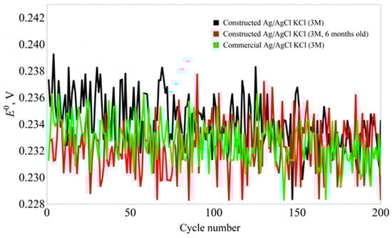 CV measurements were performed to test the stability of the reference electrode designed during this research. Initially, the stability of the RE potential was tested in an extended cyclic voltammetry experiment. Here, designed REs were used in cyclic voltammetry-based measurements by 200 voltammetry cycles (Figure 4); during this experiment, no significant shift of redox-active compound (HMF) reduction potential was observed. The same REs were similarly evaluated after six months of shelf life. During that time, electrode bodies with PAM-G membranes were suspended in 3 M KCl. Before use, the REs were washed and filled with a fresh 3 M KCl solution, and an Ag/AgCl electrode was placed into the cell. After cyclic voltammetry measurements, no significant difference in performance was observed once again, suggesting that PAM-G-based membranes do not disintegrate over at least six months and that their age does not affect the accuracy of measurements. It should be noted that the preparation of PAM-G based membranes is very simple in comparison to more sophisticated hydrogel-based structures used in electrochemical systems [,]. Thus, PAM-G based membranes can be prepared in batches and kept until use, making them an excellent candidate for the design of disposable electrodes.