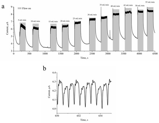 (a) Three-electrode configuration flow cell experiment where RE electrode was tested at various flow rate conditions. Measurements performed using 5 mM potassium ferrocyanide and 0.1 M sodium phosphate buffer, pH 7.0, at 0.4 V set to working platinum electrode. (b) High resolution graph of the same experiment at flow rate of 10 mL/min from 650 to 655 s.