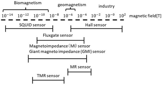 Magnetic sensors detect the magnitude and direction of magnetic fields with high sensitivity without physical contact [,]. There are a wide variety of operating principles of magnetic sensors, and they are applied in many fields, such as the automobile, academic, industrial, and medical fields. Automobiles use more than 40 sensors, including angle sensors, speed sensors, and current sensors. They are important devices, indispensable for automatic driving. Magnetic sensors are also used in the biomagnetic field for measuring magnetoencephalograms and magnetocardiograms. Gyro sensors are used in wearable computers. Magneto resistance (MR) or tunnel MR sensors are used in magnetic hard disk devices and authenticity determination devices for bills and the like. Furthermore, in the aerospace field, gyro sensors are used for attitude control of spacecraft and artificial satellites. Figure 1 shows the relationship between the magnetic sensors and measurable magnetic flux densities (their sensitivities). The magnetic flux density required for biomagnetism and geomagnetism are 10−14–10−9 and 10−6–10−5 T, respectively, and that value is above those for industrial use. In the medical field, superconducting quantum interference device (SQUID) sensors are mainly used for biomagnetic measurements (magnetoencephalography, magnetocardiography) []. Fluxgate sensors are also used for magnetoencephalography with ~300 array sensors. Magnetoimpedance (MI) sensors and MR sensors are used as electronic compasses.