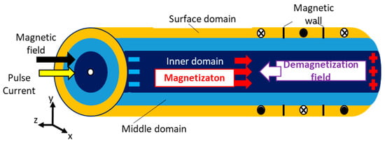 Figure 2 shows the magnetic domain structure generally considered for zero-magnetostriction amorphous wire [,,,,,,,,,]. The easy axis of the magnetization is induced in the circumferential direction of the wire due to the compressive stress generated in the surface layer of the wire during the ultra-quenching process in water. Furthermore, the circumferential magnetic anisotropy in the surface domain is strengthened by tension annealing after thinning by cold drawing after ultra-quenching. Since the inner domain of the amorphous wire cools more slowly than the surface layer, the shape magnetic anisotropy induces magnetic anisotropy along the wire axis, namely the easy axis of the magnetization is the longitudinal direction []. The magnetization of the middle domain between the surface and the inner domains is determined so that the total magnetic energy is minimized []. The magnetization of the middle domain is related to the distribution of the residual quenching stresses within the Co-rich amorphous wire []. The problem is that a demagnetization field is generated from the magnetic poles at both ends of the inner domain against an external magnetic field in the wire axial direction, reducing the effective magnetic field of the inner domain. In addition, minute magnetic domains are generated at both ends of the inner domain to reduce the magnetostatic energy, but because the magnetization changes due to discontinuous domain wall motion, it becomes a source of large magnetic noise. Hence, both ends of the inner domain of the wire are the sources of the demagnetization field and the magnetic noise. Therefore, to realize a compact and highly sensitive micromagnetic sensor, a sensing mechanism that does not use the inner domain of the amorphous wire is required.