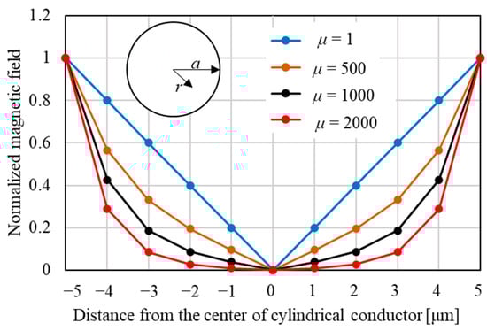 where is the skin depth, is the electrical resistivity, is the angular velocity of the current, and is the magnetic permeability. Figure 3 shows permeability dependence of the magnetic field distribution in a cylindrical conductor calculated using Equation (2) []. The horizontal axis is the distance from the center of the cylindrical conductor to the circumference.