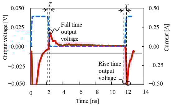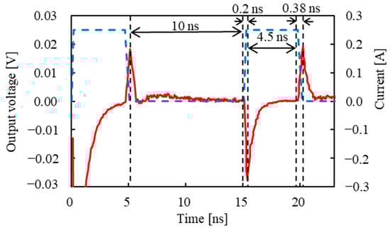 Figure 9 shows the pulse current waveform and an example of the output voltage. In this study, the output voltages at the rise and fall times of the second wave of the pulse current were investigated. The maximum current value was 0.25 A; the rise time of the pulse current was 0.2 ns; and the fall time was 0.38 ns, which matches the actual measurements. The interval between the first pulse wave and the second pulse wave was set to 10 ns, and the energizing time of the pulse current was 4.5 ns.