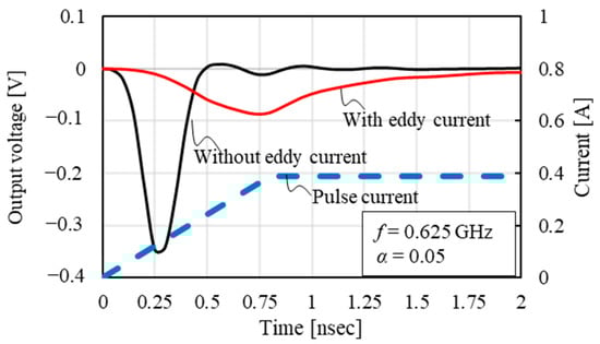 In this section, we determine whether the simulation program correctly incorporates the effects of eddy currents. Figure 6 shows the comparison between the output voltages at the rise time of the pulse current with and without the eddy current. The rise time was 0.8 ns for the pulse current. From this, the maximum output voltage without and with the eddy current is obtained as −0.341 V at 0.25 ns and −0.0861 V at 0.75 ns, respectively. Hence, the eddy current reduced the maximum output voltage and caused a large time delay. Therefore, we confirmed that the effect of eddy currents appeared in the calculation result.