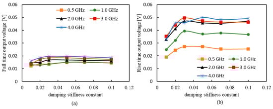 Figure 7a,b shows the dependence of the rise-time output voltage and the fall-time output voltage on the damping constant, respectively. Both are the results of changing the frequency from 0.05 to 4 GHz. As shown, both output voltages at rise and fall times increased with the increasing frequency and peaked at 0.03–0.04 and slightly decreased after that. Therefore, a high output voltage can be obtained with a damping constant of ≥0.03. A previous study reported that the measured damping constant was 0.008 []. Based on this result, investigating materials or composition ratios with high damping constants may be required. We believe that it is necessary to measure and study the damping constant of zero magnetostrictive amorphous materials in the future. Furthermore, the rise-time output voltage was more than twice as high as the fall-time output voltage. We believe this is because the strong circumferential magnetic field from the pulsed current forces magnetization in the circumferential direction; therefore, the smaller the external magnetic field, the more easily the magnetization is oriented in the circumferential direction. As for the relationship with frequency, we confirmed that the fall-time output increases as the frequency increases but saturates at ~4.0 GHz. Similarly, the rise-time output voltage also increases as the frequency increases, and after exceeding 2 GHz, the increase becomes moderate and peaks at about 3 GHz. Therefore, we found that both rise- and fall-time output voltages increased up to the GHz order, which is the same result as the actual measurement.