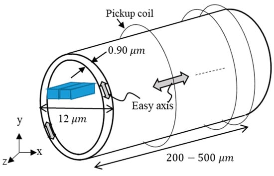 The amorphous wire has a cylindrical shape, but in this program, it was discretized with a rectangular parallelepiped cell. As shown in Figure 4, a cylindrical wire with a diameter of 10 µm and a length of 500 µm was discretized in a 0.2 µm × 0.2 µm × 50 µm cuboidal cell. Therefore, the number of cells in the x and y directions is 50, and the number of cells in the axial direction is 10. Here, the static magnetic fields normal to the surface in contact with the air were obtained by correcting (multiplied by a constant) the magnetization component to approximate the curved edges. The axis of easy magnetization of the amorphous wire was set to the z-axis direction, and the initial magnetization direction was set to the +z-axis direction.