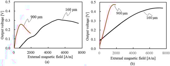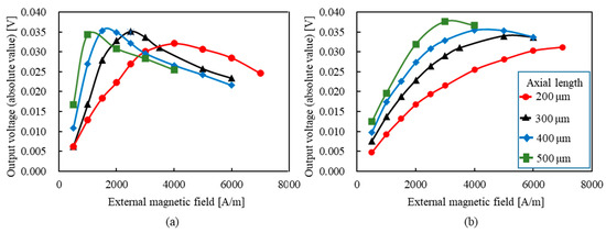 Figure 10 shows the relationship between the external magnetic field and the output voltage at axial lengths of 200–500 μm. As for the rise-time output voltage (Figure 10a), it increases with an increase in the external magnetic field for any axis length, reaches a peak value, and then decreases. The external magnetic field corresponding to the peak voltage was 4000, 2500, 1500, and 1000 A/m for the axis length of 200, 300, 400, and 500 μm, respectively. Alternatively, as the axial length increases, the rise-time output voltage reaches a peak value at a low external magnetic field. In addition, the peak rise-time voltages are almost the same, except for the slightly lower peak voltage value at 200 μm. As for the fall-time output voltage (Figure 10b), it also increases as the external magnetic field increases, reaches a peak value, and then decreases, regardless of the axial length. However, the external magnetic field of the peak fall-time voltage is higher than that of the rise-time output voltage. The external magnetic field corresponding to the peak voltage was 7000, 5000, 4000, and 3000 A/m for the axis length of 200, 300, 400, and 500 μm, respectively. As with the rise-time output voltage, as the axial length increases, the rise-time output voltage reaches a peak value at a low external magnetic field. In addition, the peak value became smaller as the axial length became shorter. Figure 11 shows the time dependence of magnetization in the z-axis (axial direction) in an external magnetic field of 500 A/m. From this, the shorter the axial length, the less the magnetization is oriented in the direction of the axial length during the 10 ns from the first wave to the second wave (the relaxation time). This is because the shorter the axial length, the more difficult it is for the magnetization to orient in the axial direction due to the demagnetization field at the end of the wire. Therefore, the shorter the axial length, the higher the external magnetic field required to direct the magnetization in the axial direction. Conversely, during the relaxation time between the first and second waves, the magnetization tends to be oriented in the axial direction because the longer the axis length is, the smaller the demagnetization field is. Therefore, the amount of magnetization in the circumferential direction increases at the rise time of the second wave, and the output voltage increases. Furthermore, at the fall time of the second wave, the longer the axial length of the wire because of the smaller demagnetization field, the more easily the magnetization is oriented in the axial direction, as in the first wave. Figure 12 shows the measured values of the relationship between the external magnetic field and the output voltage. From this, the external magnetic field, where the rise-time output voltage has a peak value, is 5171 and 795 A/m for the axis length of 160 and 900 μm, respectively. Therefore, the shorter the axial length, the higher the external magnetic field when the output voltage reaches the peak value. The same trend occurred for the fall-time output voltage. The external magnetic field, where the fall-time output voltage has a peak value, is 7160 and 1750 A/m for the axis length of 160 and 900 μm, respectively. Furthermore, the external magnetic field that reaches the peak value of the rise-time output voltage is lower than that of the fall-time output voltage. A similar trend was observed in the experimental results under other conditions of rise and fall times. These trends of the experiments also coincide with the simulation results shown in Figure 10.